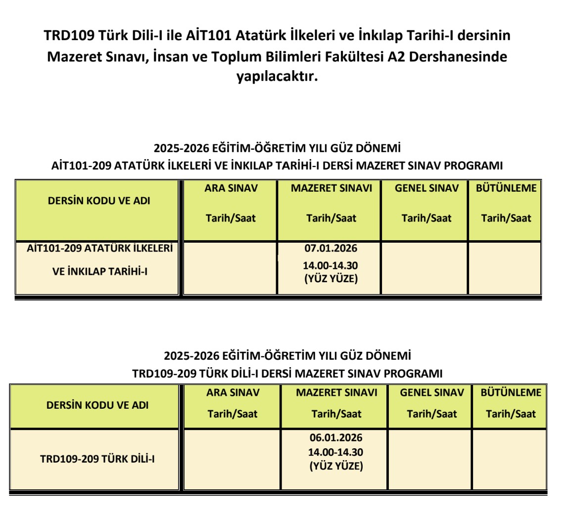 Sevgili Öğrenciler, TRD ve AİT Ortak derslerinin mazeret sınav takvimi açıklanmıştır.